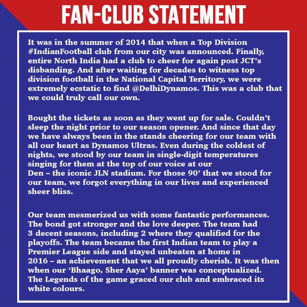 It is always hard to lose something you love but despite the pain, one has to move on. We got past the sorrow and took it upon ourselves to change the face of football in Delhi. Football in Delhi has had a downfall lately. Low attendance and pollution in the winters were part of the reasons for which Delhi Dynamos left the capital city. Now, with the management of Delhi United FC in our hands and a constant support from Minerva Fc and Mr. Ranjit Bajaj the great football revolutionist. We aim to change things for the better and bring the lost Glory back to Delhi .Our idea would be to make the concept of fans managing a football club reach out to more and more people in the city. The road ahead is tough but so is our mentality. Jai ultras ❤️