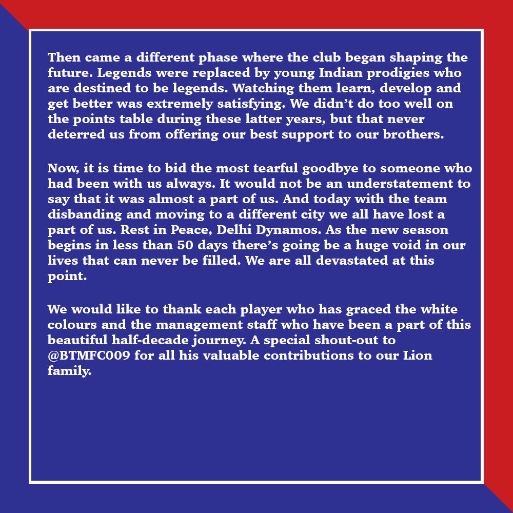 2018-19 season was not a season we would like to remember because the team wasn’t performing well and the fan club had issues to face related to the club . Rumors had started to float around by the second half of the 18/19 season. According to them, Delhi Dynamos would shift its base to Odisha next season. A sense of fear was beginning to rise in our minds. We were all worried that the club which had become like a family to us would get dissolved by the end of the season. Time passed by and the rumours kept on growing. Rohan Sharma had completely commercialized the club! He didn’t retain a single player from the squad that qualified to the semi-finals for two seasons in a row, not even the coaching staff. To add to our agony, he did a fraud by lying to us about opening a residential academy which apparently didnt happen. This ultimately resulted in breaking the core of the team and coaching staff. The only greatest contribution he did was breaking the team into pieces and completely shattering the dream of many individuals of seeing their own club becoming great.